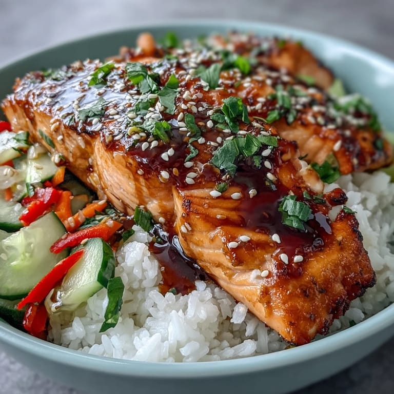 Every element in this bowl pulls its weight. The rice is the canvas, neutral enough to let the glaze take center stage but flavorful enough that you actually want to eat it on its own. The vegetables add crunch and color, cutting through the richness of the salmon so the whole experience feels balanced rather than heavy. The edamame brings protein and a little earthiness that keeps everything interesting, and the glaze—that's the magic that ties it all together, making you feel like you're eating something intentional rather than just throwing food on a plate.