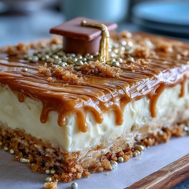 This stunning graduation sheet cake features a soft, buttery base topped with silky vanilla buttercream. White chocolate is transformed into a striking gold drip with edible luster dust, adding a touch of elegance. A center mortarboard topper crowns this festive creation, making it the centerpiece for any graduation celebration. Flavor and texture come together for a memorable dessert that serves 24. Decorate with gold sprinkles for extra flair and pair with sparkling drinks for a celebratory finish. Suitable for vegetarian diets and medium skill levels, it's perfect for honoring graduates in style.