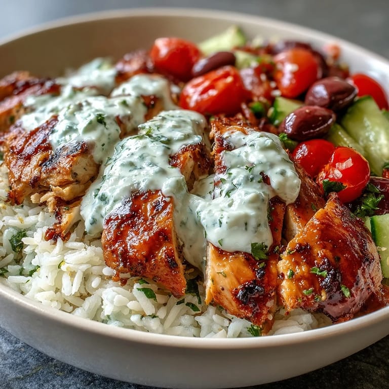 What makes this bowl feel so satisfying is the interplay between warm and cool elements playing against each other. The hot rice and chicken contrast beautifully with the chilled salad and creamy tzatziki, creating a textural and temperature experience that engages your entire mouth. This is why I don't recommend serving the salad warm or the rice cold; the difference between them is what makes the whole thing work.